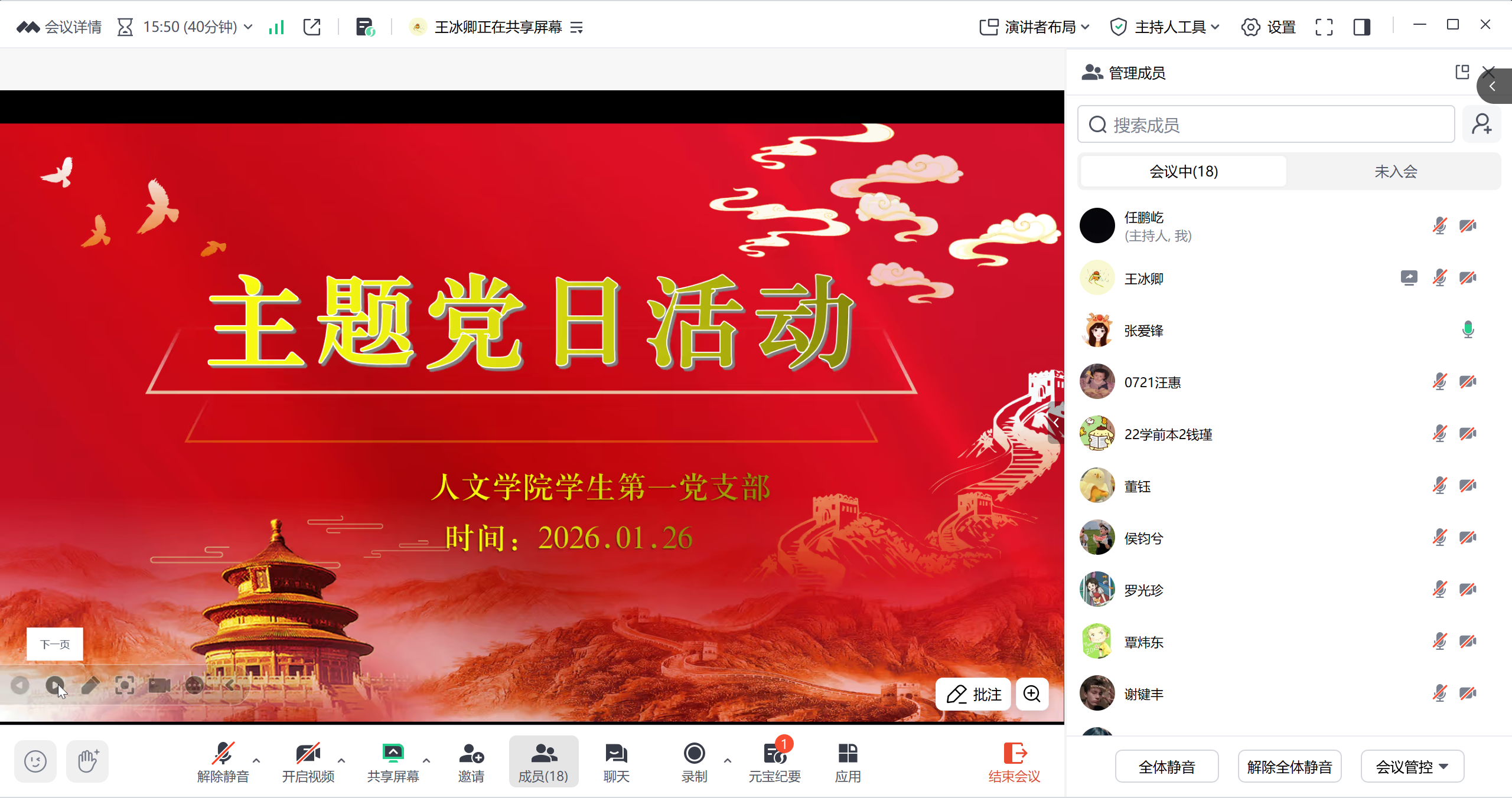 为深入学习贯彻习近平新时代中国特色社会主义思想,筑牢党员廉洁自律防线,以优良作风开启新年新征程,1月26日,人文学院学生第一党支部以“岁首谋新篇,实干开新局”为主题,以线上形式开展一月主题党日活动。全体支部学生党员参与活动,活动由人文学院学生第一党支部书记张爱锋主持。