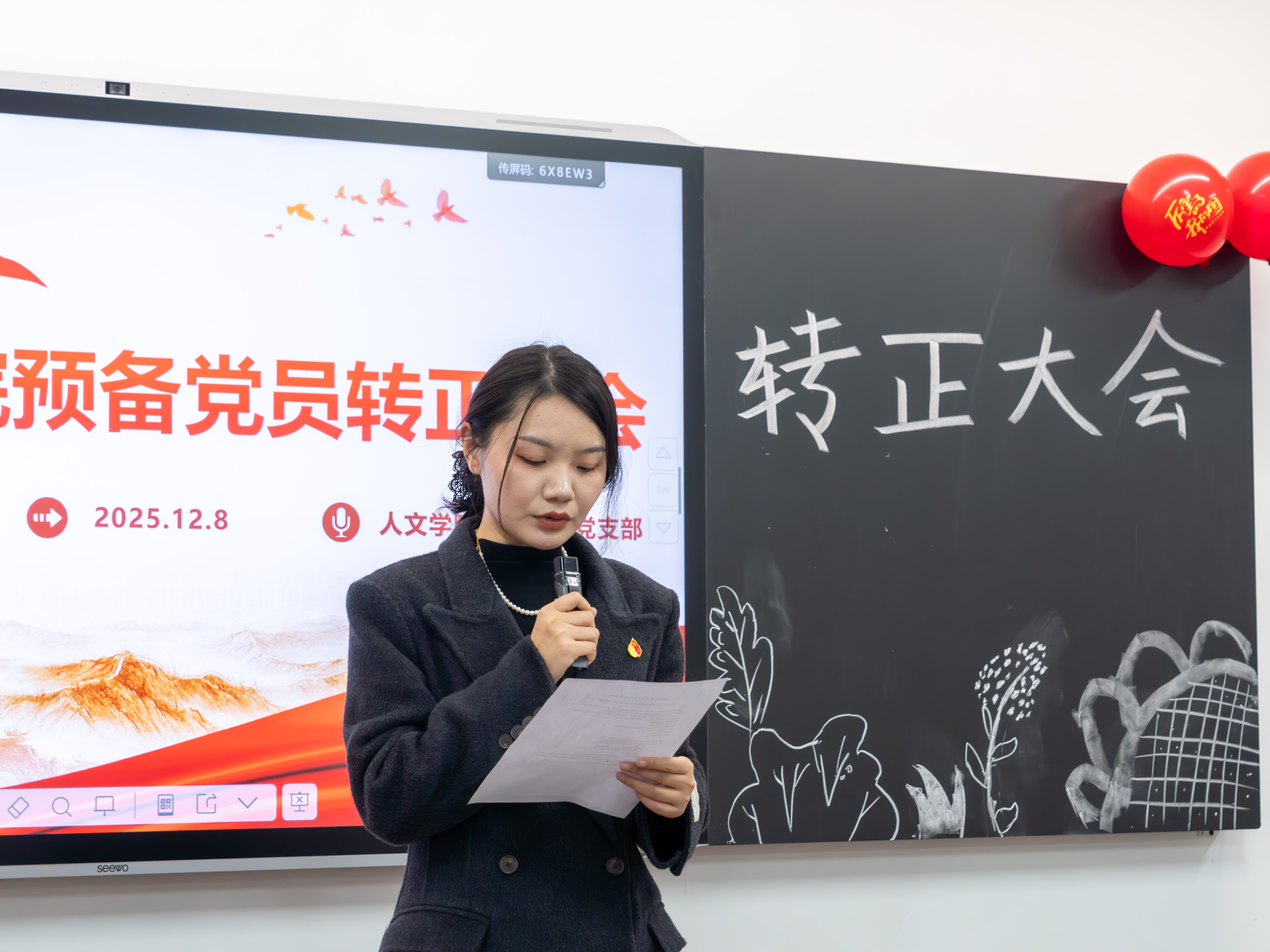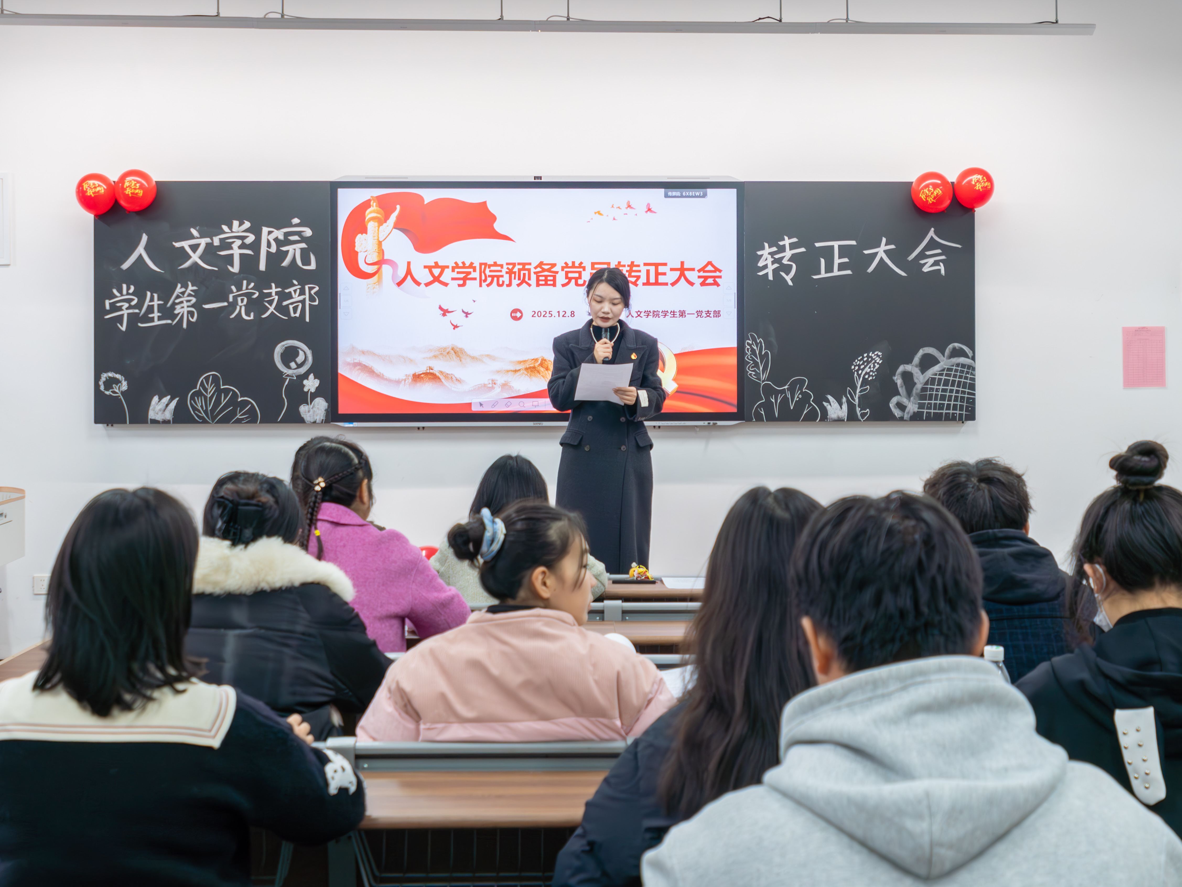 本网讯(通讯员 吴心怡 任佳炫)为严格落实党员发展程序,检验预备党员培养教育成果,为党组织注入新鲜血液、凝聚奋进力量。2025年12月8日,人文学院学生第一党支部在四教103教室举行了下半年预备党员转正大会。人文学院学生第一党支部书记张爱锋,支部组织委员彭祎,支部宣传委员魏妮以及培养联系人陆莉出席此次大会,支部全体学生党员参加本次大会。大会由张爱锋主持。