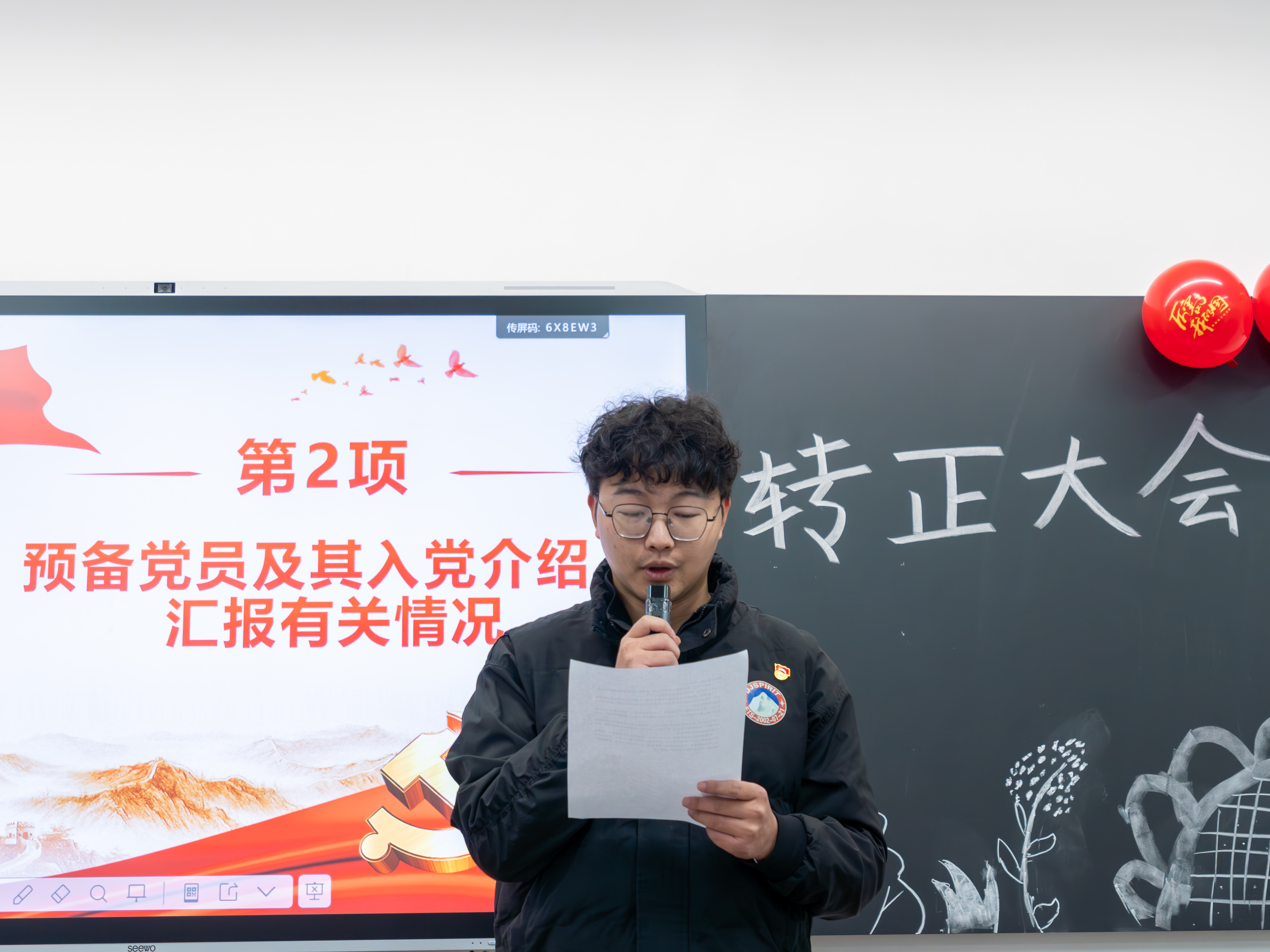 接着,进入无记名投票表决环节。在彭祎宣读投票规则、明确注意事项后,党务助理现场分发、回收选票,全体党员本着公平、公正、严肃的原则,对谢键丰、王思的转正申请进行民主投票。投票结束后,彭祎当场统计票数并宣读大会决议,一致同意接收谢键丰和王思两名同志为中国共产党正式党员,现场响起热烈掌声,向两名新转正党员表示祝贺。