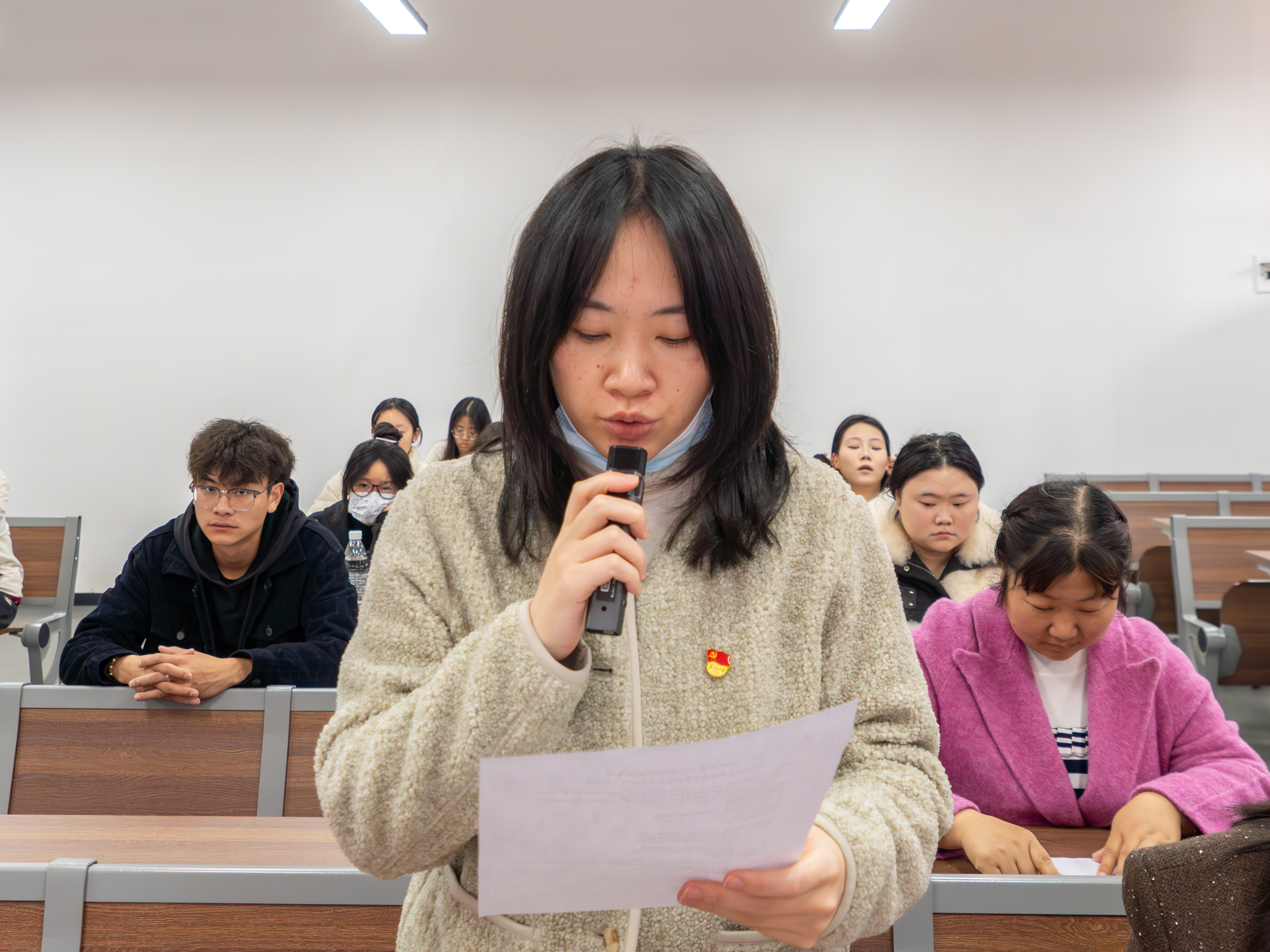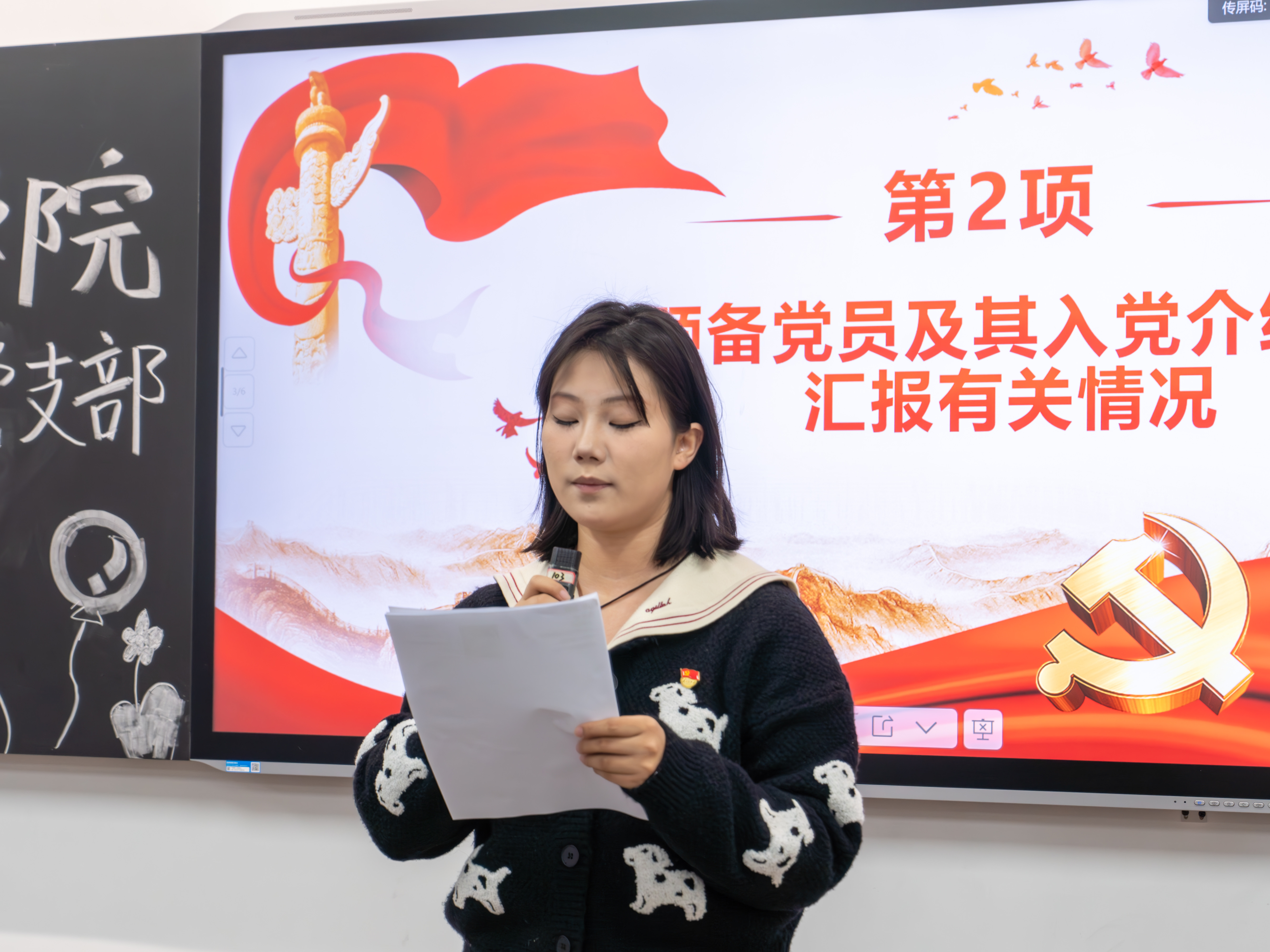 随后,两名预备党员及入党介绍人依次汇报情况。预备党员谢键丰首先向党支部作转正申请汇报,从思想学习、专业实践、服务同学等方面详细阐述预备期间的成长与收获,深刻剖析自身不足与改进方向;其培养联系人陆莉、魏妮同志分别结合日常观察,客观评价谢键丰在预备期内的表现,一致认为其思想觉悟高、行动自觉,已具备正式党员条件。紧接着,预备党员王思汇报预备期情况,她不仅总结了思想提升与工作实绩,更主动检视自身在理论学习深度、服务主动性等方面的不足,展现出自我革新的清醒认知;其培养联系人魏妮对王思的进步给予充分肯定,认为其态度端正、改正及时,符合转正要求。