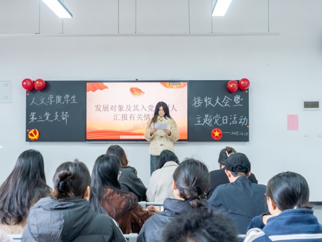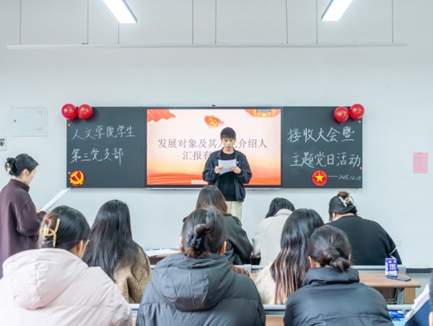 本网讯(通讯员 李欣怡 任佳炫)为进一步加强党员队伍建设,为党组织注入新生力量,12月18日,人文学院学生第三党支部在四号教学楼104室召开预备党员接收大会暨12月主题党日活动。人文学院学生第三党支部书记成风,组织委员王峥出席活动,支部全体学生党员参加。大会由成风主持。