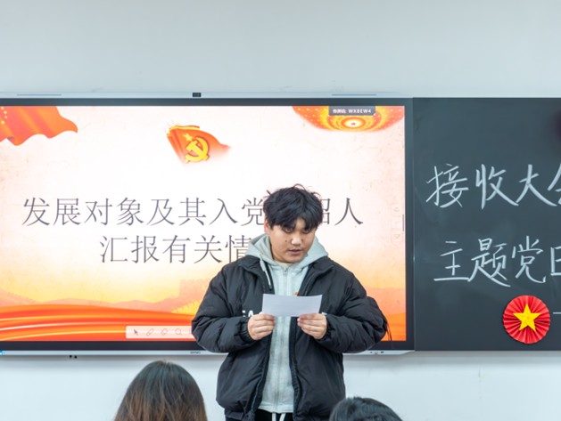 新接收的预备党员代表周鹏宇作表态发言。他表示,将以此次入党为新的起点,严格遵守党章,加强理论修养,立足学生本职,发挥模范作用,以实际行动践行入党誓词。