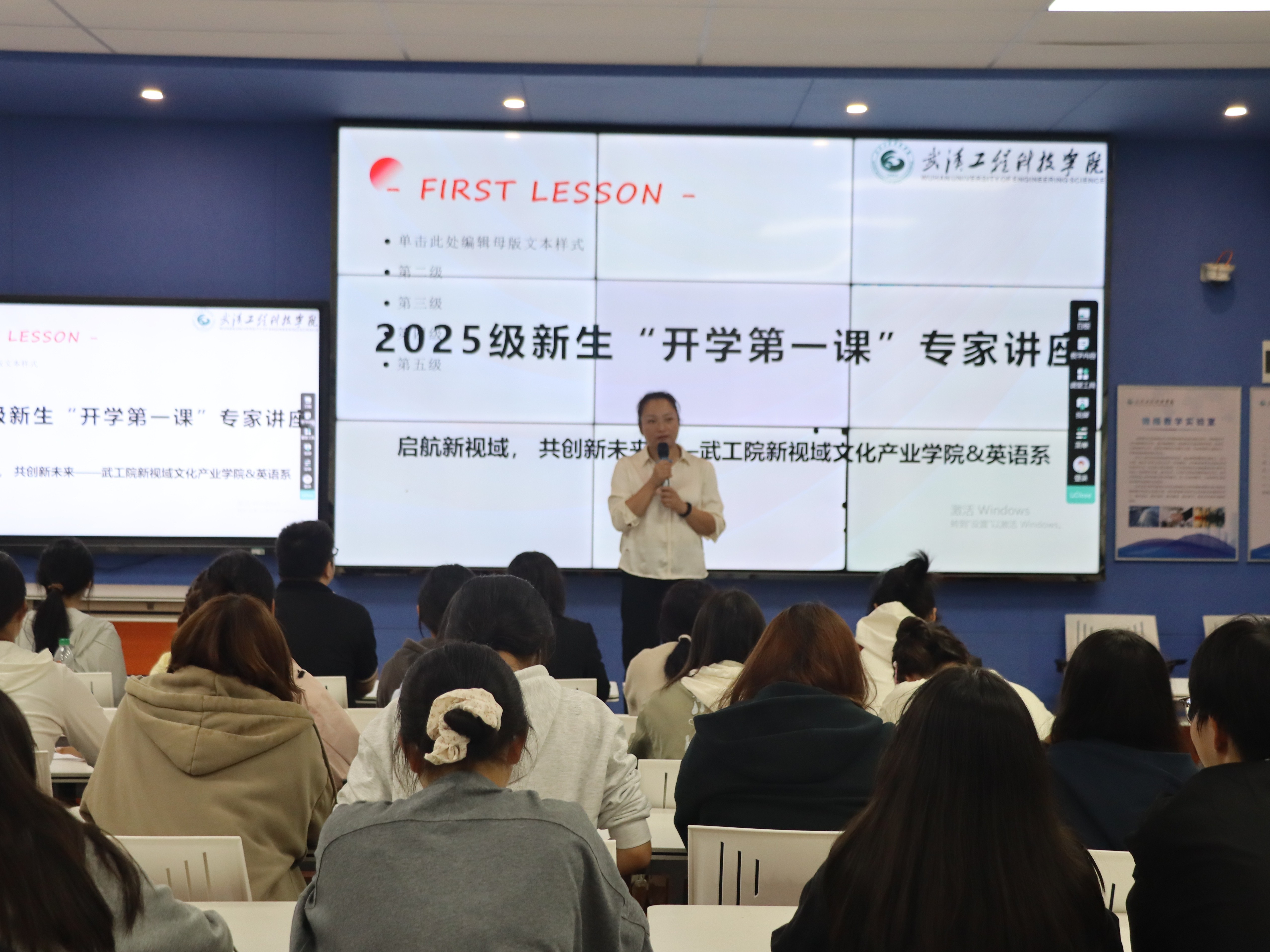 2025为了给2025级英语类专业新生启迪学业规划、照亮未来航向,10月15日,人文学院于一号教学楼104室开展了一场别开生面的“开学第一课”专家讲座。本次活动由武工院新视域文化产业学院(英语系)主办。特邀湖北工业大学外国语学院副院长李池利,人文学院教学副院长吴海燕,英语系主任孙川慧和商务英语专业负责人陈坦老师与英语专业2025级新生共同探讨大学四年的学习生涯与未来发展方向。活动由英语系主任孙川慧主持。