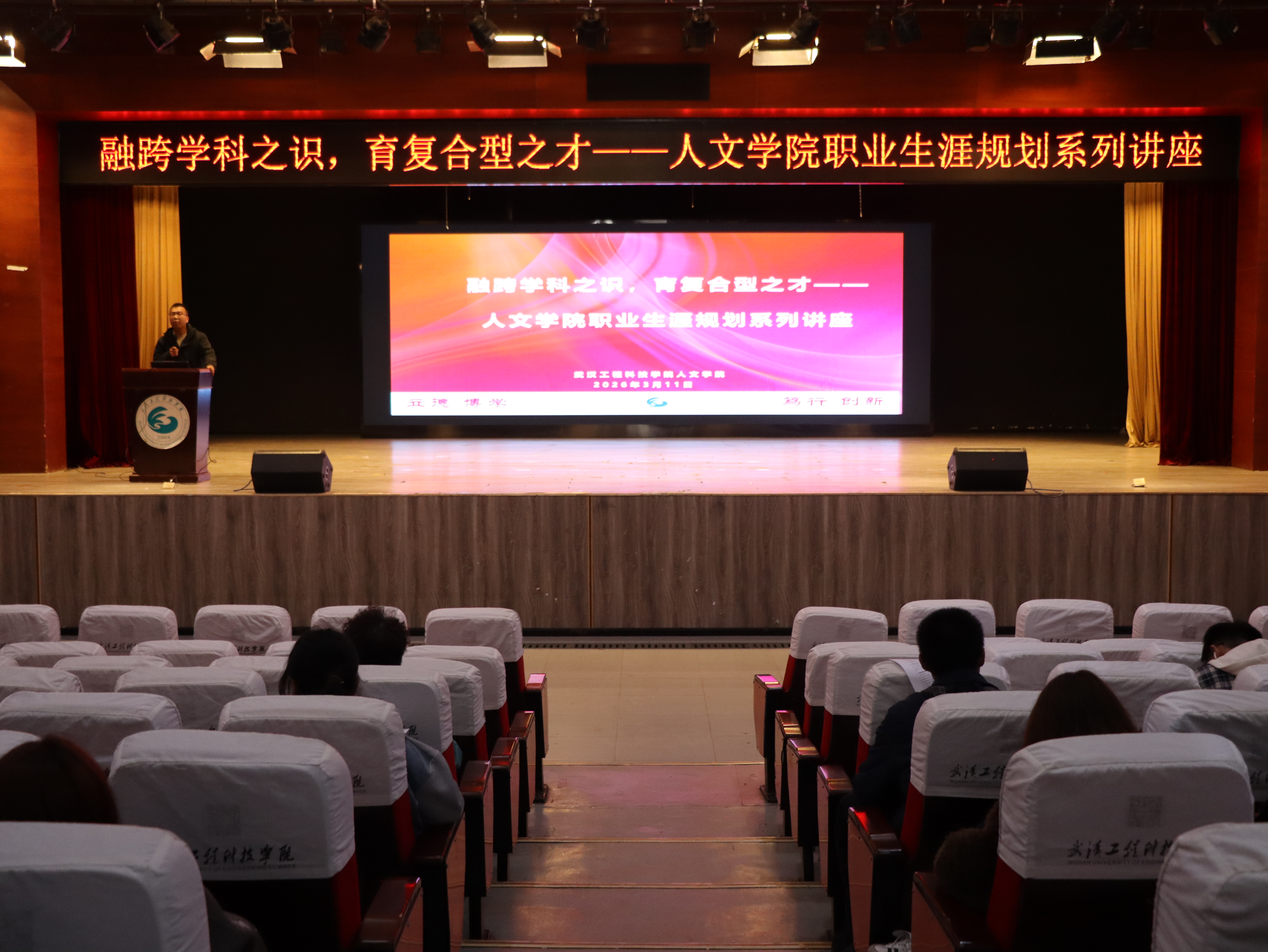 2026为助力2025级汉语言文学(语教)专业学生明晰学业规划、把握职业发展先机,3月11日下午,人文学院在三号教学楼报告厅顺利开展“融跨学科之识,育复合型人才”职业生涯规划系列讲座。本次讲座由人文学院学生第一党支部书记张爱锋主持,人文学院汉语言文学专业教师常晨担任主讲人,为同学们带来了一场兼具深度与实用性的学业指导盛宴。