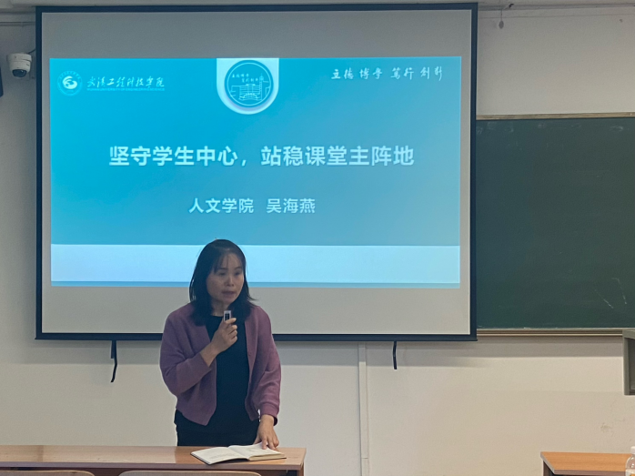 随后,吴海燕就学校教学规范的落实情况进行阶段性总结并提出改进意见,旨在进一步提升教学质量,推动学院各项工作规范有序开展。她结合近期质管中心反馈以及人文学院查课情况,对发现的问题进行案例分析,强调教师应严守教学纪律,端正教学态度,切实发挥示范引领作用。她指出,落实立德树人,必须系统构建高质量的教学现场:一是筑牢环境防线,确保教学空间的纯粹与秩序;二是把好言论关口,坚守课堂讲授的专业与严谨;三是强化师德师风,保障教学投入的专注与高效。三者协同,方能切实捍卫教育的崇高性与有效性。