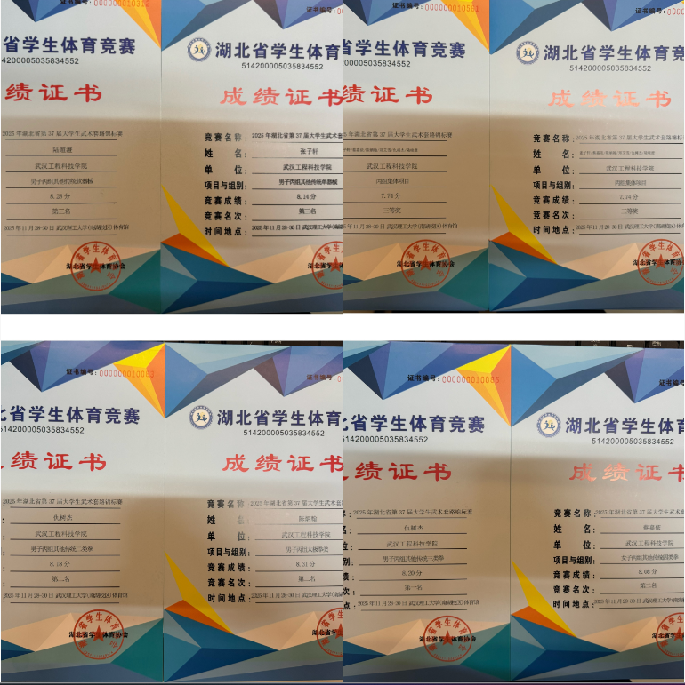 本网讯(通讯员 徐娅妮)2025年11月28日至30日,由湖北省大学生体育协会主办的湖北省第37届大学生武术套路锦标赛在武汉理工大学体育馆隆重举行。本届赛事规模盛大,吸引了来自全省56所高校的550名武术健儿同台竞技。我校武术队在领队易鹏老师、教练员高俊和黎文老师的率领下,派出6名运动员参加了共计十一个单项的角逐。队员们不畏强手,奋力拼搏,最终凭借精湛的技艺与出色的发挥,在个人项目与团体荣誉上均取得历史性突破,共斩获1金、4银、2铜的优异成绩,并荣膺“体育道德风尚奖”,充分展现了我校学子昂扬的精神风貌和深厚的体育素养。