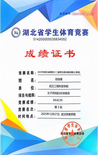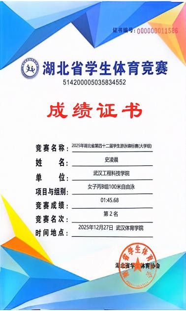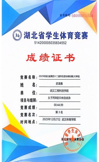 本网讯(通讯员李明)12月27日,2025年湖北省大学生游泳锦标赛在武汉体育学院成功举办。我校14名学生在郭生鼎、李明老师的带领下与省内28所高校298名选手展开激烈角逐。